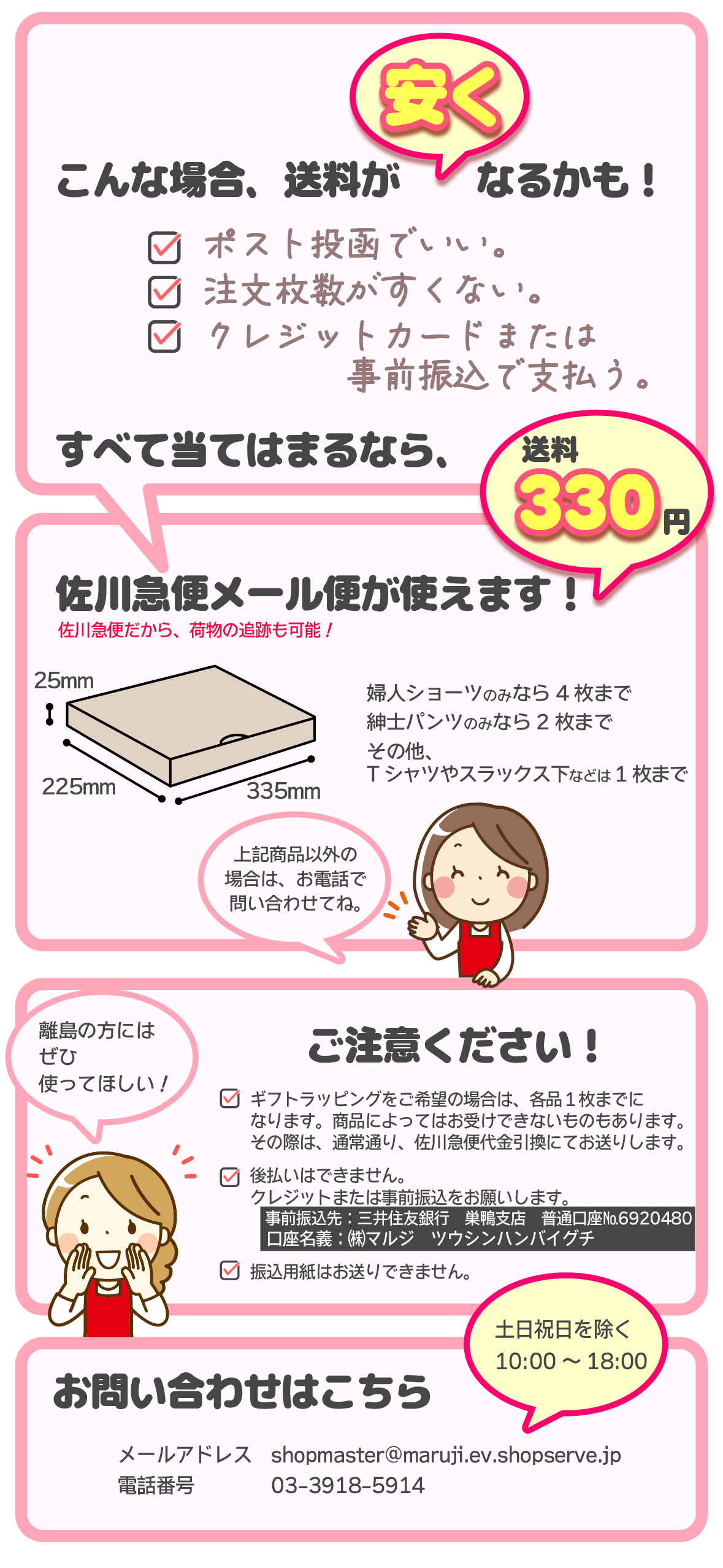 ●毎週土・日曜日、祝日は、お休みさせて頂いております。 ●休日の場合、メールやお問い合わせは翌営業日になります。また、発送はご注文後4日以降(ただし 週末が入るときは5日後以降)の指定日になります。 お問い合わせ